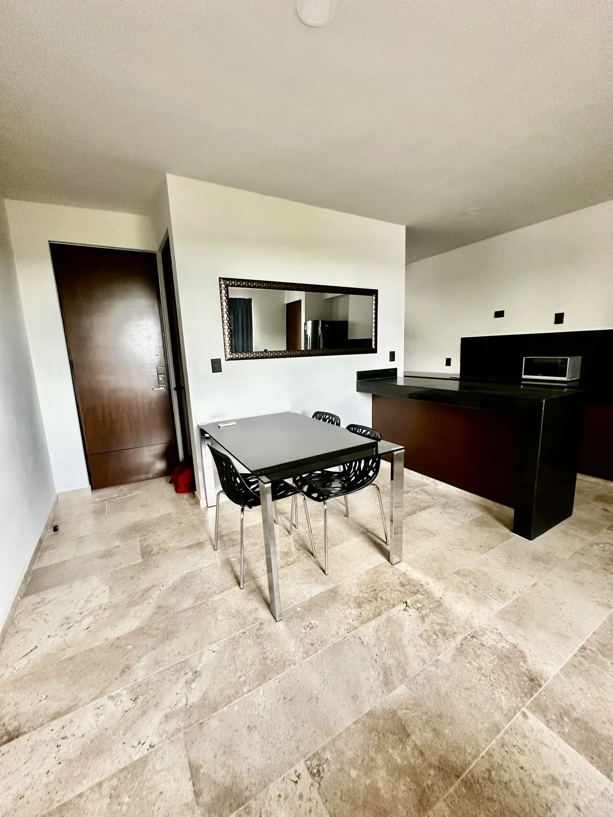 Renta de departamento consta de sala comedor corridos , cocina con barra desayunador y meseta de granito , 1 recamara con vestidor ,baño AA y , 1/2 baño de visitas.